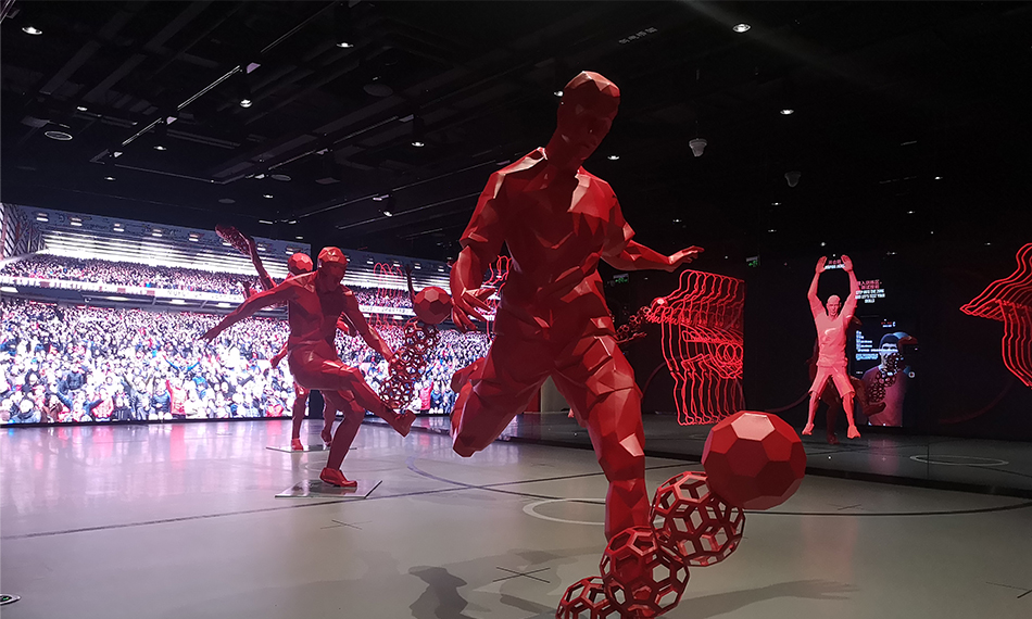 仁歌負(fù)責(zé)2層博物館和B1層游戲屋的音視頻、互動(dòng)系統(tǒng)搭建。2層博物館主要以模擬現(xiàn)場(chǎng)氛圍及沉浸式互動(dòng)體驗(yàn)的形式,回溯曼聯(lián)的歷史重大事件——沉浸式體驗(yàn)不僅還原了當(dāng)年老布拉德利的更衣室等實(shí)際場(chǎng)景,并伴以虛擬的音視頻及互動(dòng),讓觀眾身臨其境。B1層是足球互動(dòng)體驗(yàn)區(qū),分為17個(gè)游戲屋,每個(gè)場(chǎng)景以足球游戲?yàn)橹黝},配合聲光電及互動(dòng)系統(tǒng),讓體驗(yàn)者切身體驗(yàn)足球主題的樂趣,沉浸在足球帶來(lái)的快樂之中。