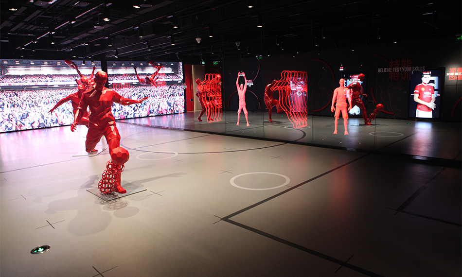 仁歌負(fù)責(zé)2層博物館和B1層游戲屋的音視頻、互動(dòng)系統(tǒng)搭建。2層博物館主要以模擬現(xiàn)場(chǎng)氛圍及沉浸式互動(dòng)體驗(yàn)的形式,回溯曼聯(lián)的歷史重大事件——沉浸式體驗(yàn)不僅還原了當(dāng)年老布拉德利的更衣室等實(shí)際場(chǎng)景,并伴以虛擬的音視頻及互動(dòng),讓觀眾身臨其境。B1層是足球互動(dòng)體驗(yàn)區(qū),分為17個(gè)游戲屋,每個(gè)場(chǎng)景以足球游戲?yàn)橹黝},配合聲光電及互動(dòng)系統(tǒng),讓體驗(yàn)者切身體驗(yàn)足球主題的樂趣,沉浸在足球帶來(lái)的快樂之中。